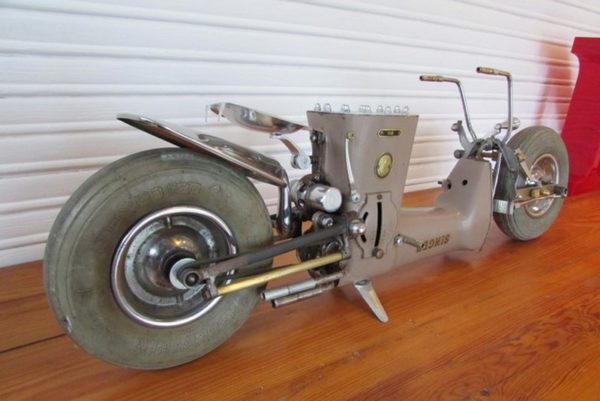 Sculpture réalisée sur la base d’une ancienne machine à coudre et de diverses pièces de provenances improbables (vieux rétroviseur de Coccinelle, pièces de tire-bouchon, mâchoire de freins de vélo, roues d’ancien fauteuil roulant , etc…..)