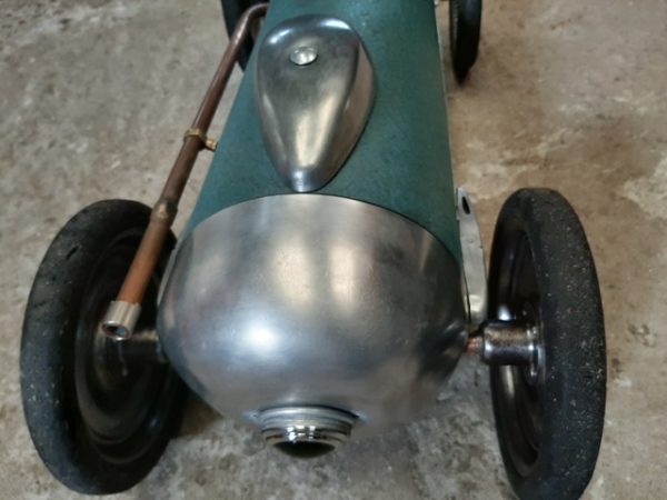 Ce petit bolide a été créé sur la base d’un ancien aspirateur Paris-Rhône des années 50. il est composé de pièces de provenances diverses tels que les roues issues d’une très ancienne poussette pour enfant.